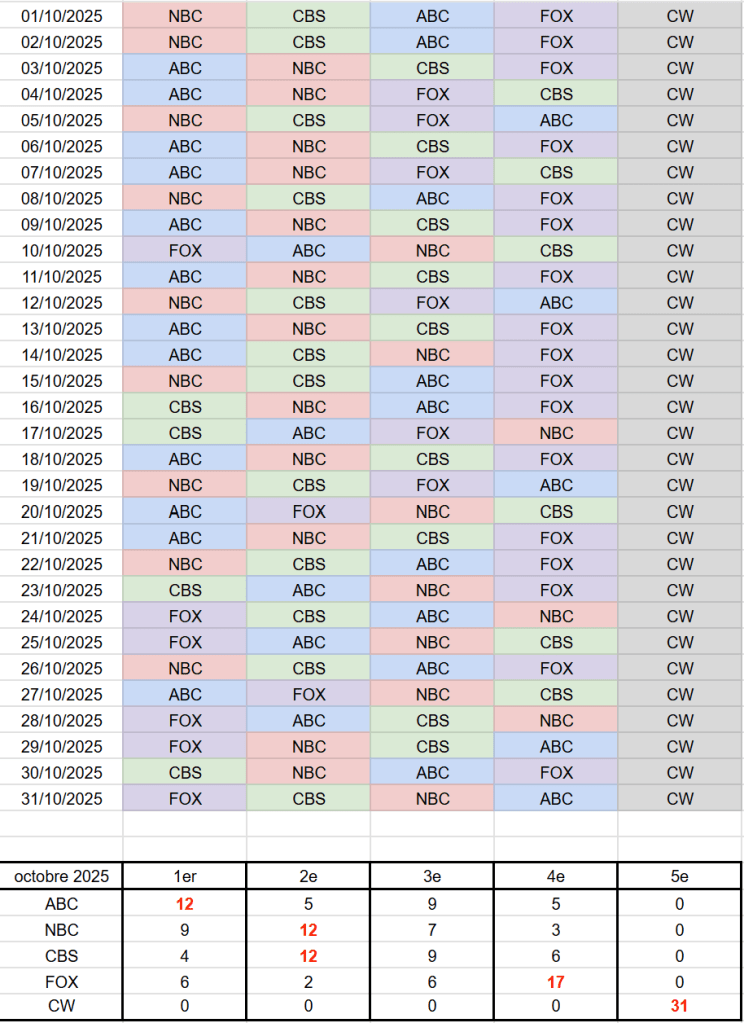 Comme en septembre, c’est ABC qui domine le nombre de leaderships sur le mois. ABC a été 12 fois leader (-3) en octobre contre 9 fois (-4) pour NBC.