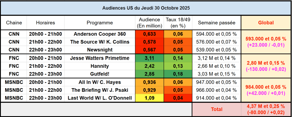 Audiences des chaines infos : FOX News leader en baisse. CNN et MSNBC progressent légèrement.