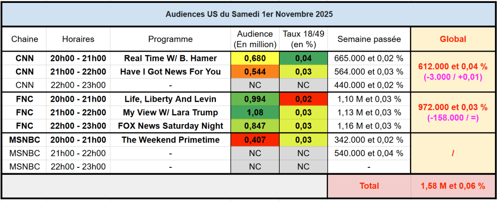 Audiences des chaines infos : FOX News leader en nette baisse, passe sous le million. Bon score pour les programmes de CNN et MSNBC.