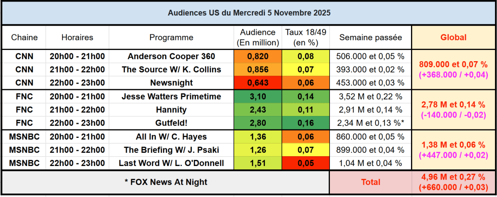 Audiences des chaines infos : FOX News en baisse en ce lendemain d’élections mais reste leader. En revanche, CNN et MSNBC sont en forte hausse. MSNBC signe une très belle soirée.