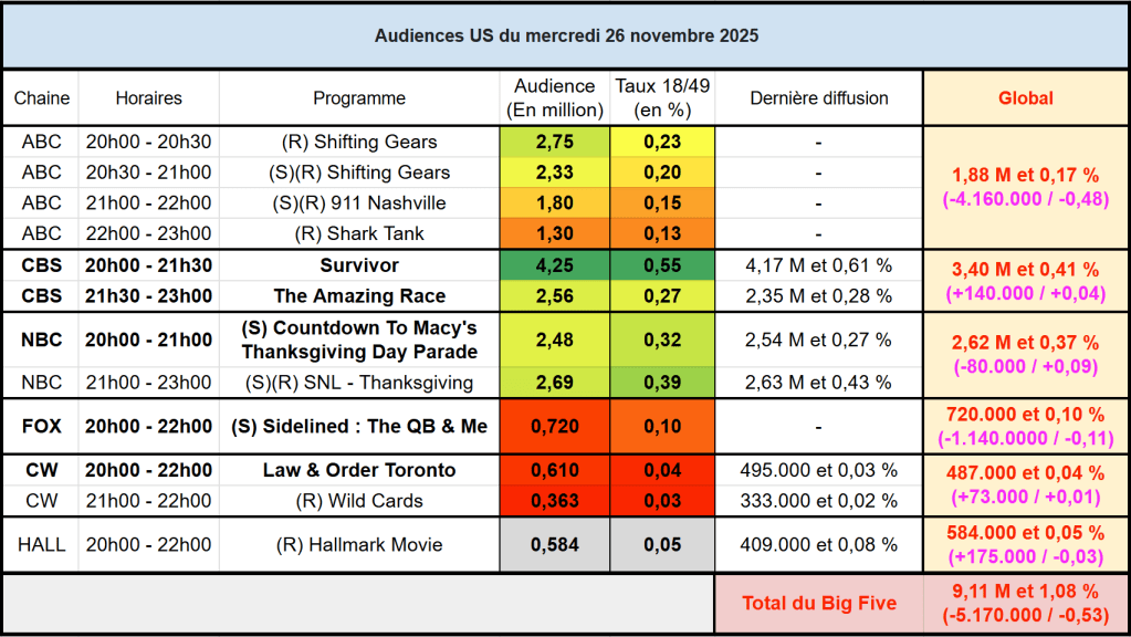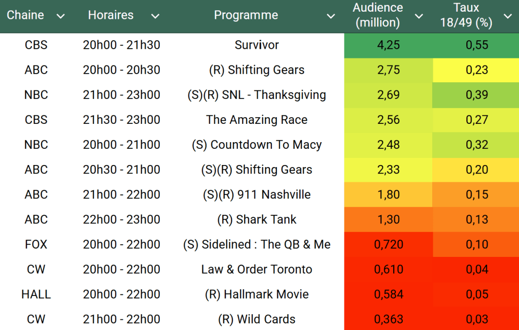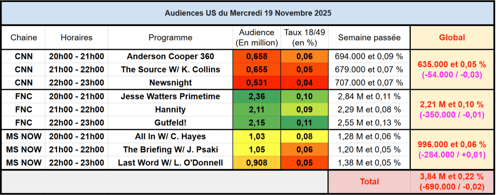Audiences des chaines infos : En cette veille de Thanksgiving, toutes les chaines sont en baisse. Les baisses sont plus marquées pour FOX News et MS NOW.