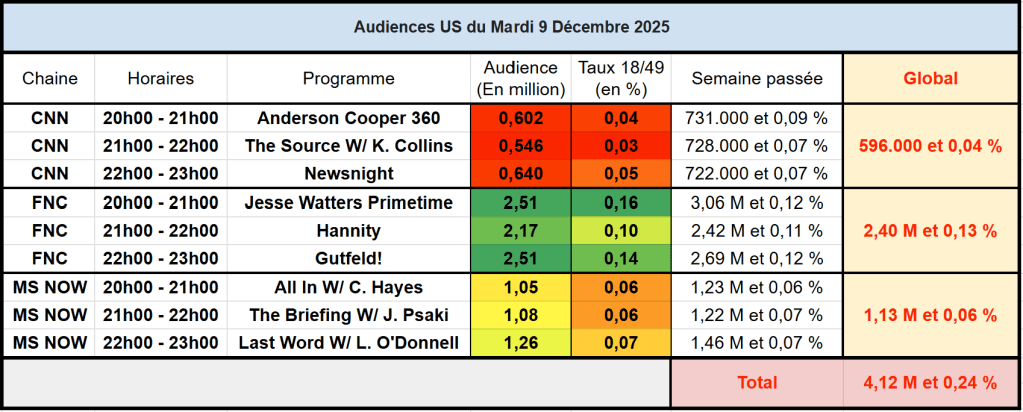 Audiences des chaines infos : FOX News large leader. Jesse Watters en forme sur cible.