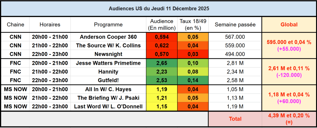 Audiences des chaines infos : FOX News leader en baisse. MS NOW et CNN progresse légèrement. MS NOW qui signe de bonnes soirées en ce moment.