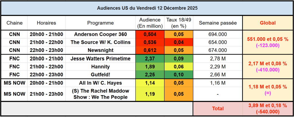 Audiences des chaines infos : Après de très bonnes soirées vendredi dernier, CNN et FOX News sont en nette baisse. MSNBC est en revanche stable à un bon niveau.