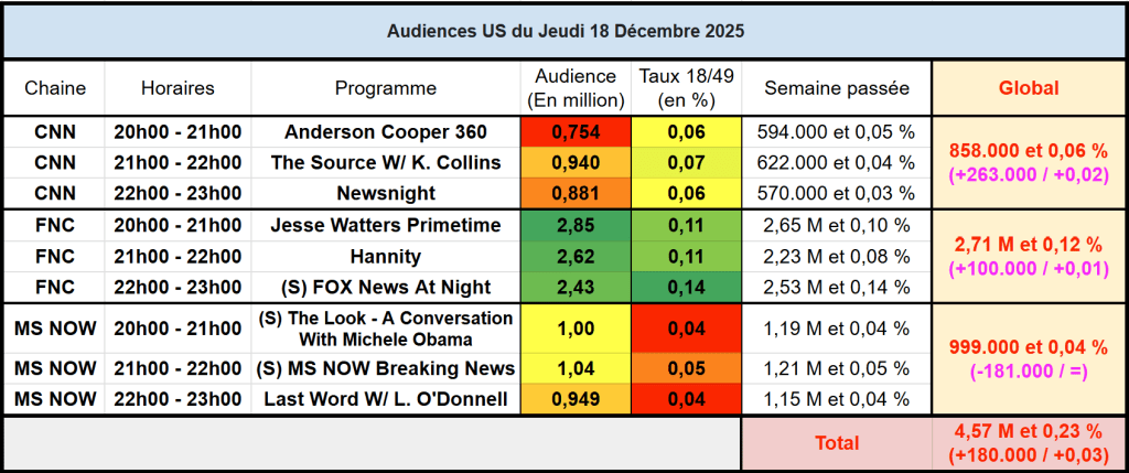 C’est le cas de CNN, qui atteint 940k à 21h et signe une excellente soirée. FOX News aussi en belle forme. MS NOW est en revanche en nette baisse.