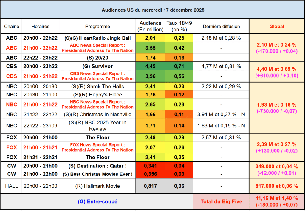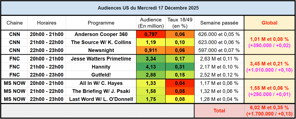 CNN dépasse le million de 21h à 22h – FOX News dépasse les 4 millions sur ce même créneau. MS NOW frôle les 1,8M à 22h