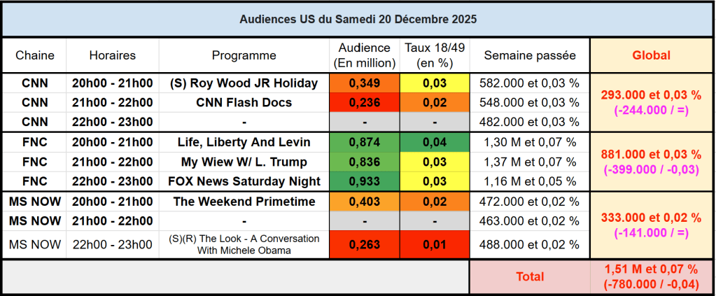 Audiences des chaines infos : Avec une actualité moins dense (tireur université Providence samedi dernier), les 3 chaines infos sont forcément en très forte baisse. FOX News domine toujours.