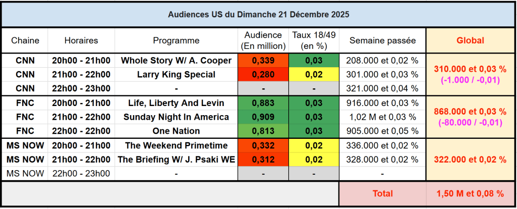 Audiences des chaines infos : FOX News leader en baisse. CNN et MS NOW sous les 350k.