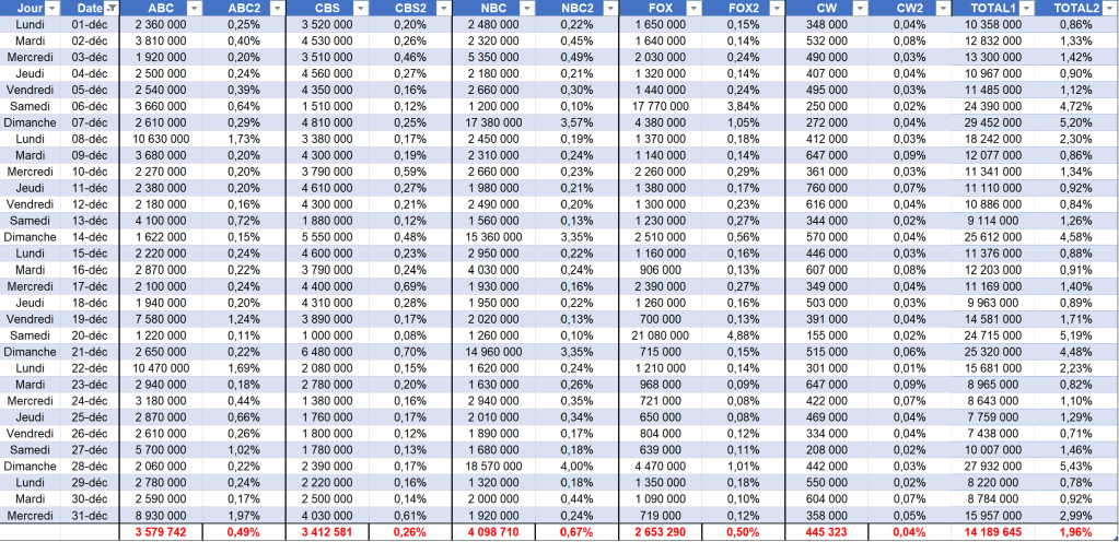 Audiences de tous les programmes en prime de ABC, CBS, NBC, FOX, CW et Hallmark en Décembre (rangés par téléspectateurs)