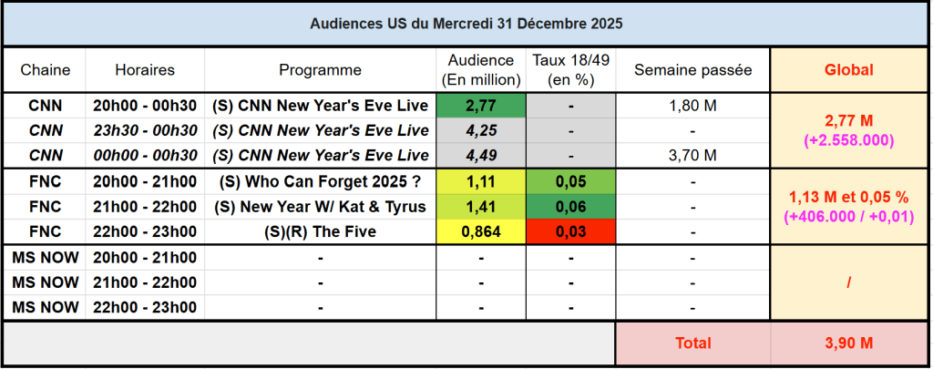Audiences des chaines infos : Carton pour CNN, en forte hausse sur un an, qui s’approche des 2,8 M en moyenne sur l’ensemble de la soirée et dépasse les 4M dans les alentours de 00h.