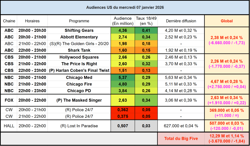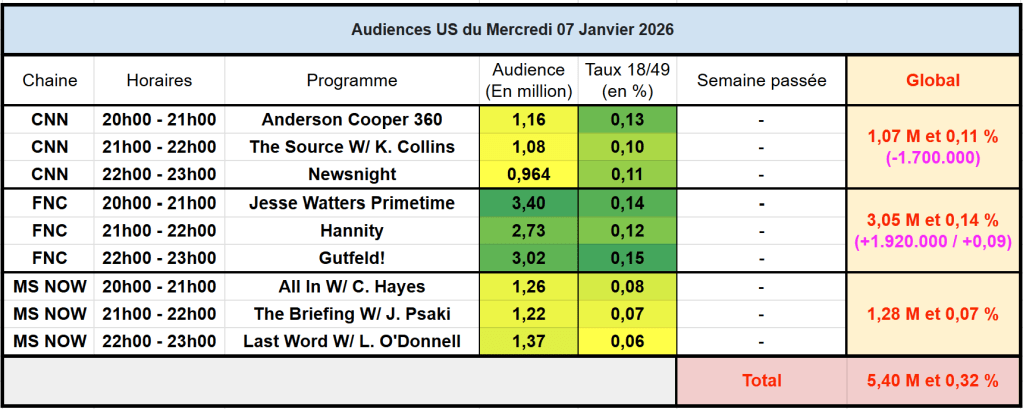 Audiences des chaines infos : Avec une forte actualité avec la fusillade de l’ICE à Minneapolis, CNN connait une très forte soirée et dépasse le million de 20h à 22h. CNN est également en très grande forme sur cible, nettement devant MS NOW et jouant avec FOX News, qui elle dépasse les 3 millions.