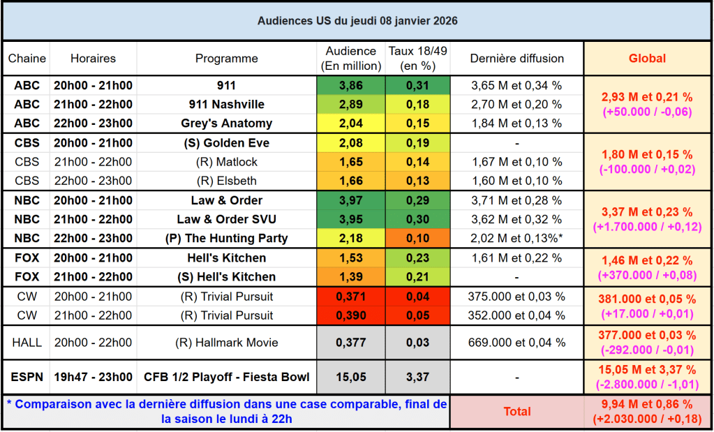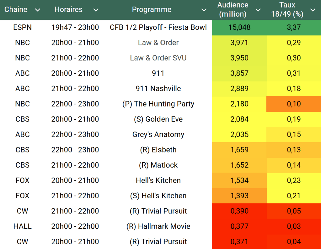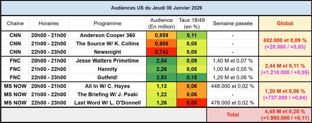 Audiences des chaines infos : FOX News en en forte hausse sur une semaine (fêtes), mais en nette baisse comparé au début de semaines. CNN reste en très grande forme par contre, au dessus des 800k très bonne sur cible. CNN est leader cible à 20h et leader = à 21h. MS NOW installé autour des 1,2 M sur la soirée.