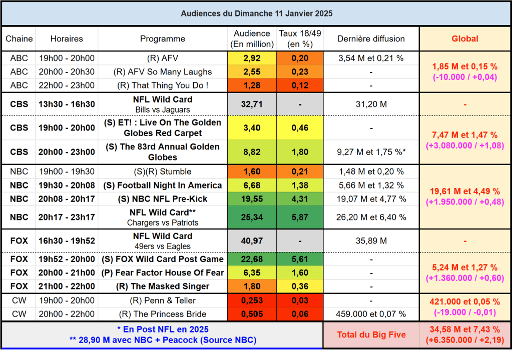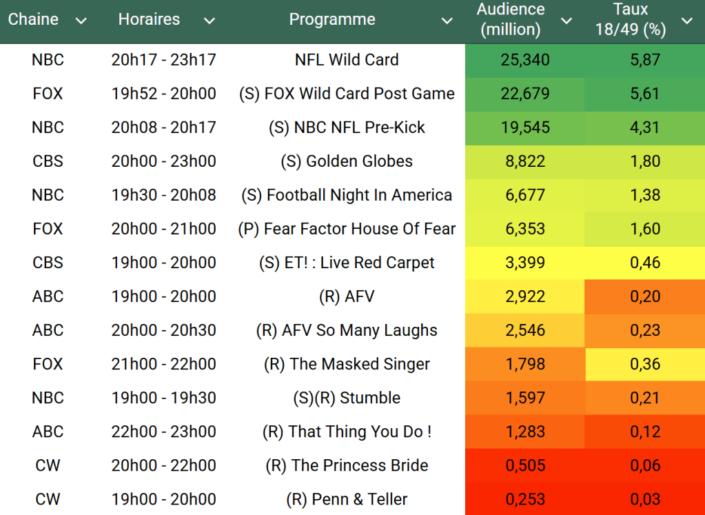CBS 13h30 – Bills vs Jaguars : 32,71 M = Record historique pour un match AFC Wild Card dans cette fenêtre (31,20 M en 2025, sur CBS pour Broncos/Bills)