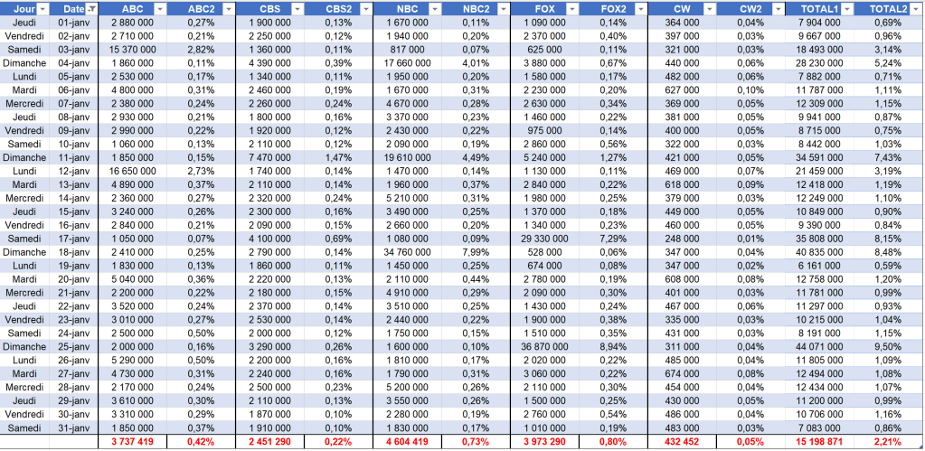 FOX deux gros match de NFL signe un mois de janvier forcément en très forte hausse avec +1,32 M et +0,30 pt. FOX est devant ABC et CBS.