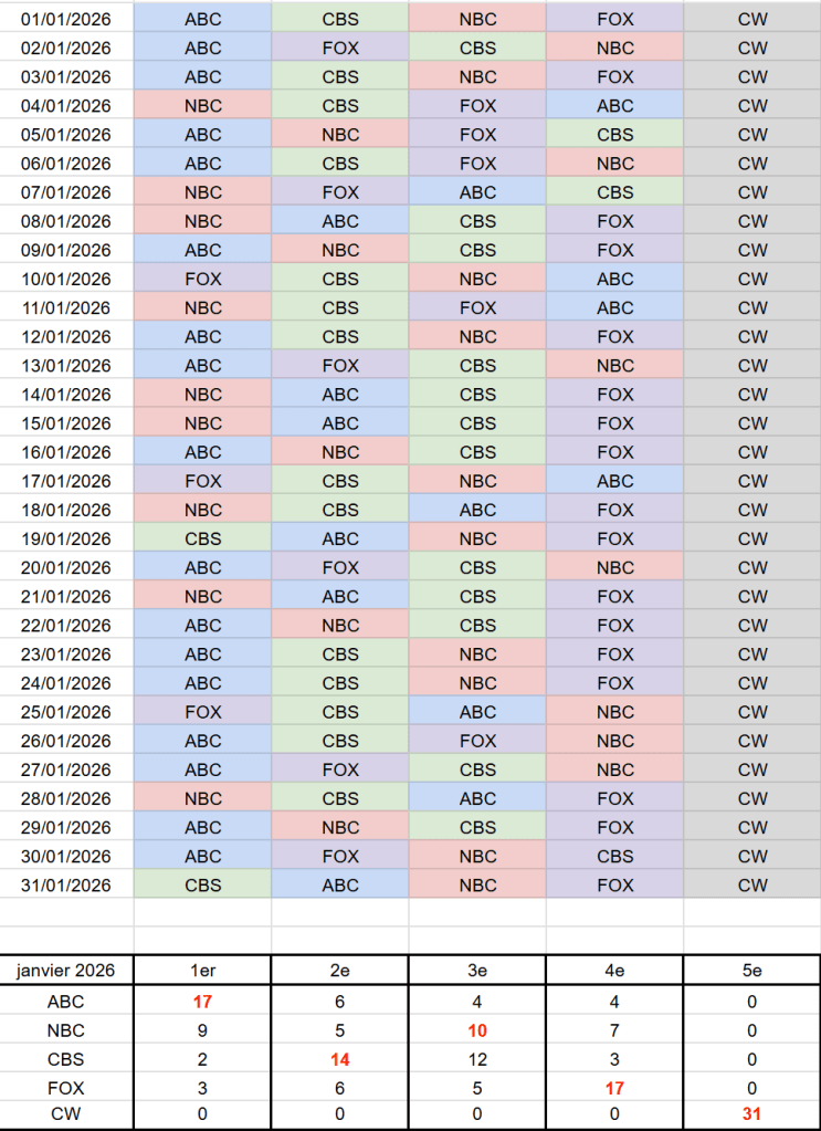 Mois de janvier très très compliqué pour CBS avec seulement 2,45 M en moyenne sur le mois. C’est une baisse de 961k par rapport à décembre 2025 et -0,04 pt sur cible. CBS est 4e en janvier.